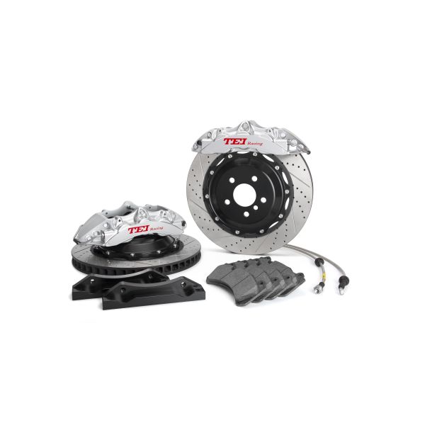 Go fast and stop faster. TEI Racing Big Brake Kits provide you with serious braking power when you need it most. TEI Racing brake kits are offered for both the front and rear brakes with rotor sizes ranging from 285mm-405mm drilled or slotted or drilled and slotted, 2-6 piston Forged Monoblock aluminum caliper options, and custom colors. Stainless steel brake lines, brake pads, and all hardware are included for a direct bolt-on installation where no modifications are required.